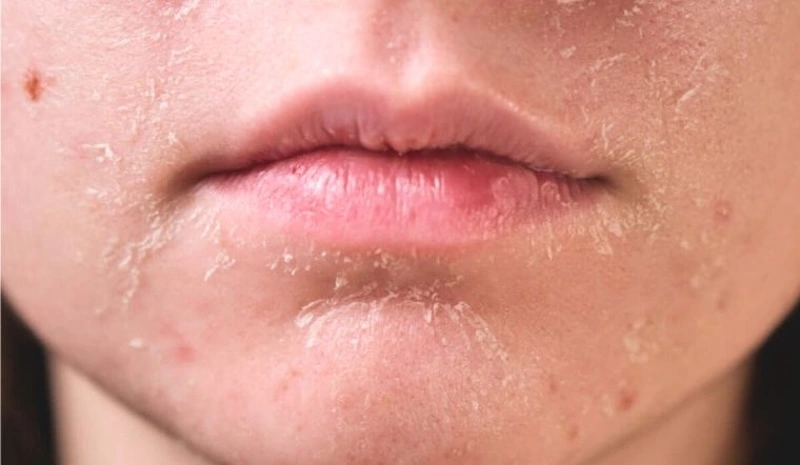 Những vảy da chết li ti như phấn hoặc bong thành từng mảng nhỏ thường tập trung ở vùng cánh mũi, hai bên má, quanh miệng, khuỷu tay và gót chân.