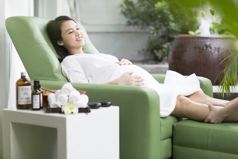 Bên cạnh đó, việc thư giãn trong một không gian yên tĩnh, với hương thơm tinh dầu tự nhiên (đã được kiểm định an toàn cho thai phụ) và âm nhạc êm dịu, giúp loại bỏ những suy nghĩ tiêu cực.